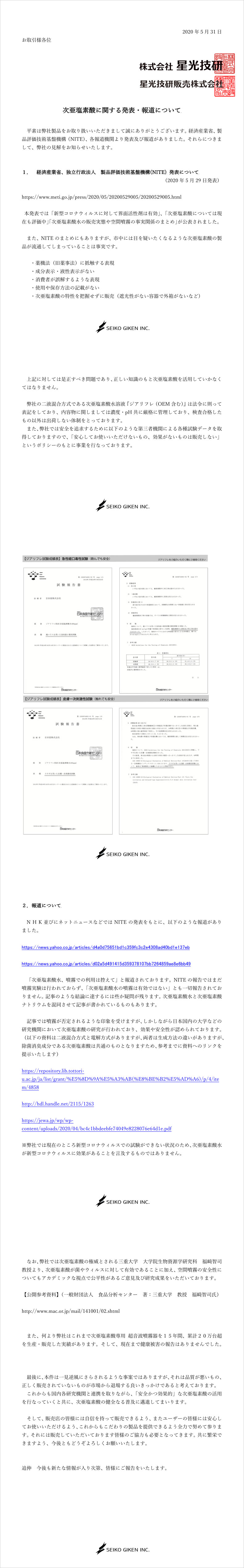1. 弊社ジアリピュアの委託生産先(製造元)の星光技研販売株式会社(容器記載の吉田屋は2020年4月に星光技研販売に社名変更されています。)、専用噴霧器の製造元である株式会社星光技研のコメントをご参照ください。(下段の添付資料「次亜塩素酸に関する発表・報道について」)